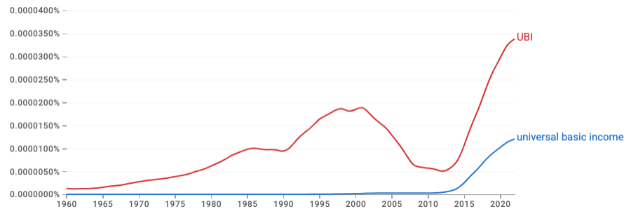 What about universal basic income (UBI), where people without employment are given a no-questions-asked income sufficient to take care of basic needs? As this Google Ngram chart shows, here’s been a lot of interest in it in recent years, especially since 2015: