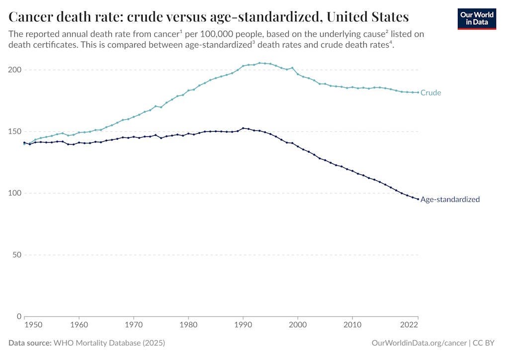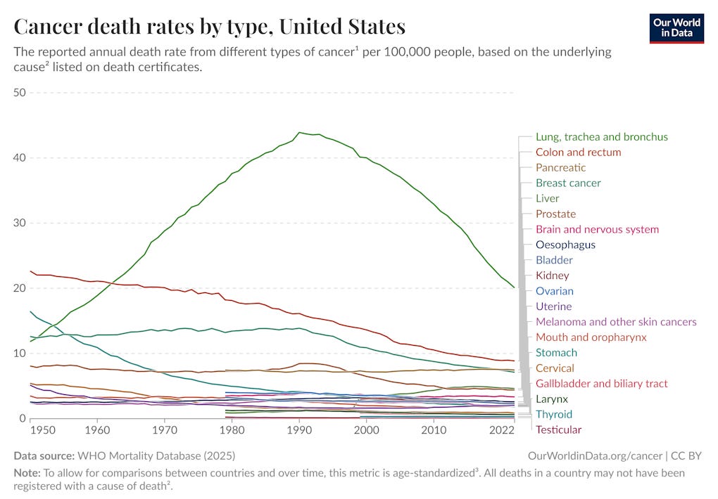 Now, there’s a common myth that cancer is an intractable disease that will never succumb to modern medicine. In 1971, President Richard Nixon launched the so-called “War on Cancer”; for many years, it was fashionable to say that cancer had won the war. But in fact, since around 1990, humanity has been making steady gains. Thanks to advances in early detection, screening, and various treatments, as well as the drop in smoking and a vaccine against a virus that causes cervical cancer, death rates have fallen at every age for almost every type of cancer. For a while this was masked by an increase in lung cancer from the smoking boom, but now that’s over too:
